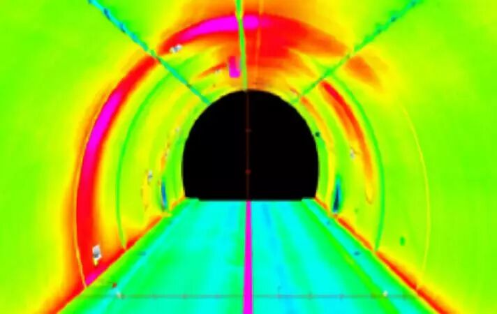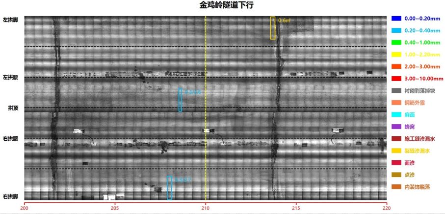 隧道快速检测装备集成高精度激光雷达、红外热像仪、线扫描三维测量传感器以及整列CCD相机,在高可靠性时空基准上同步采集温度、全局点云与局部形变以及灰度数据,通过数据融合与建模,达到一测多用,实现隧道的水害、冻害以及裂损病害集成检测,检测结果自动生成病害分布图。