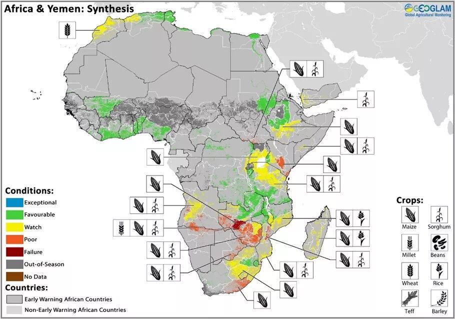 全球农业监测倡议还在农业市场信息系统(AMIS)作物监测成功运行的基础上,为主要生产国和出口国提供作物状况评估,为面临粮食安全风险的国家提供作物监测。这是与全球许多关注粮食安全的主要人道主义组织合作完成的,包括美国国际开发署(USAID)、联合国世界粮食计划署(WFP)、欧洲委员会联合研究中心(JRC)、联合国粮食及农业组织(FAO)、政府间发展管理局气候预测和应用中心(ICPAC)以及亚洲稻谷研究所。