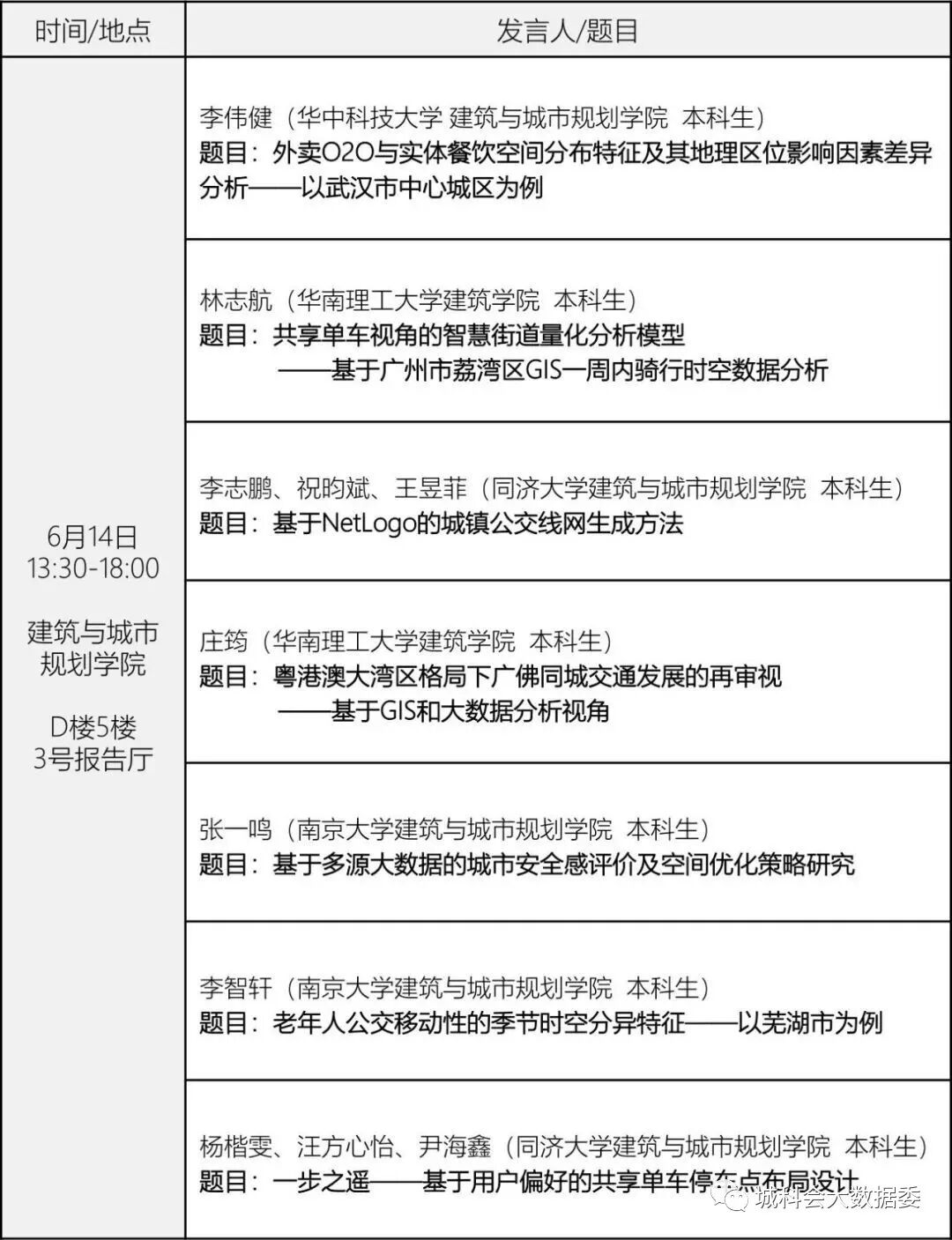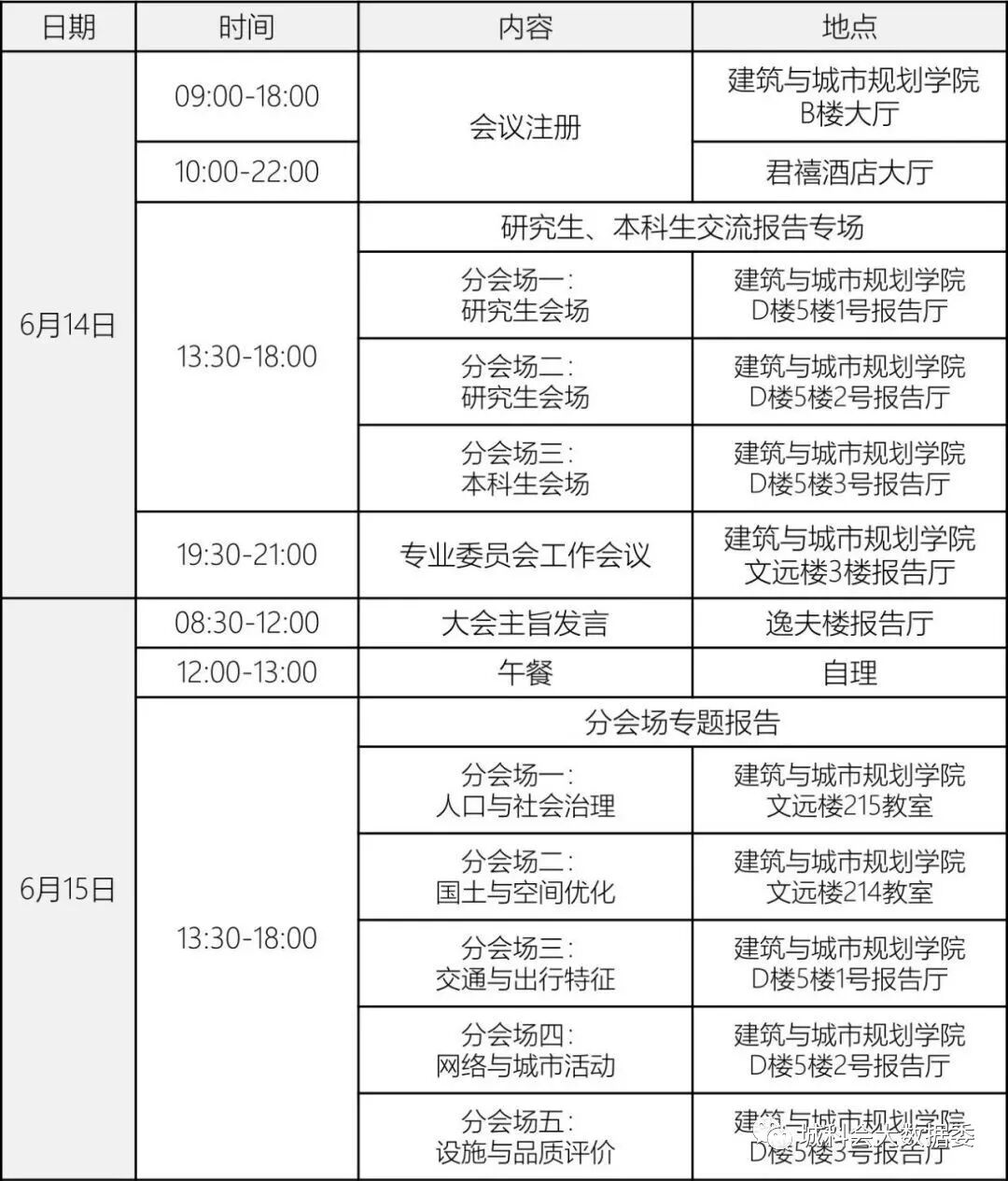 6月14日为会议注册与研究生、本科生交流报告专场,6月15号上午为大会主旨演讲,6月15号下午为5个分会场,分别是: