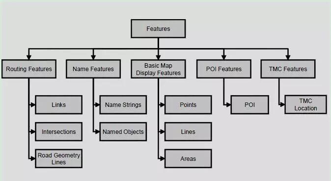 Content,其中存放了主题的地图数据,主要包含三个部分:Feature,Attribution和MetaData这个和传统的电子地图在概念上是一致的,只是其中Feature表达的内容的侧重点更偏重于道路交通等,如下图所示。