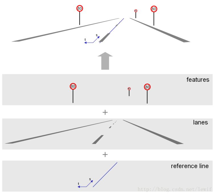 下图是OpenDrive中路网结构中的一个road,该road有三部分组成,蓝色的reference line,车道lane,车道lane的其他feature(限速等)。