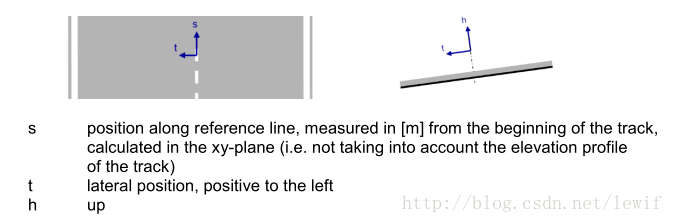 坐标系,OpenDrive中使用geoReference元素定义了该文件使用的投影坐标系,其中地理坐标系为WGS-84,而投影坐标系采用的是Transverse_Mercator,横轴墨卡托投影,这是全局坐标,局部坐标使用<s,t,h>表示,s表示参考线切线方向,t垂直于s,参考线左边为正,h表示垂向。