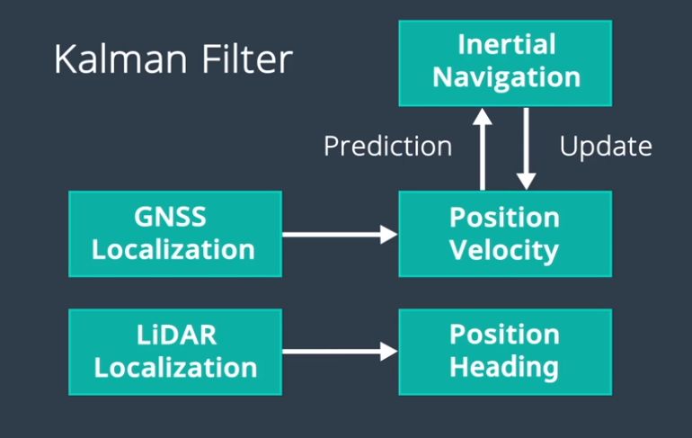 我们要在高精度地图上进行定位,这就意味着我们需要弄清楚我们在地图上的位置。RTK+惯导是我们常用的组合定位方法,RTK在空旷区域定位效果好,但是它更新频率低,容易受遮挡影响,这个时候需要引入频率更高的惯性导航进行辅助,但是惯导容易产生误差累计,因而在极端环境下这两种组合也不能做到万无一失,这时候就需要引入摄像机或者激光雷达,通过这两种设备进行图像以及点云数据的收集并进行特征提取,然后将这些特征和高精地图中的特征进行对比并融合组合定位数据从而推断出车辆自身的位置,百度Apollo使用卡尔曼滤波的方法进行传感器数据融合。