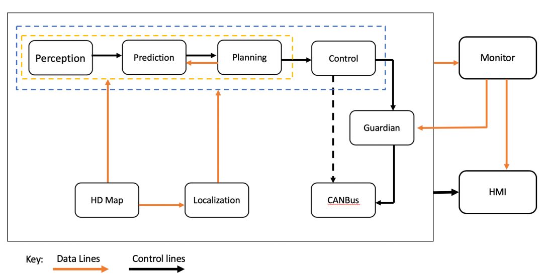 无人驾驶方案各大厂商大同小异,但是基本的逻辑是相同的,从学习的角度来看,目前已经开源的百度Apollo无疑是一个极好的途径,下面是百度的Apollo无人驾驶的软件架构以及关键模块的说明。