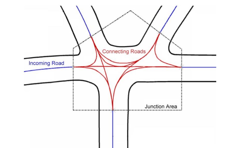 road之间的连接定义了两种(每个road有唯一的ID),一种是有明确的连接关系,例如前后只有一条road,那么通过successor/predecessor进行连接,如果前后的连接关系不是很明确,就需要一个junctions。