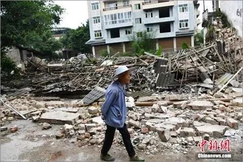 6月18日,四川省宜宾市长宁县双河镇老街,一位老人经过坍塌的房屋。6月17日22时55分,四川宜宾长宁县双河镇发生6.0级地震,震源深度16公里。 中新社记者 张浪 摄