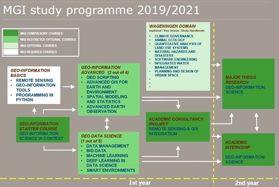 瓦格宁根地理信息科学硕士的重点是利用地理信息系统(GIS)和地球观测图像(遥感)解决农村和城市边缘地区的空间问题。本硕士课程面向环境科学(规划、土壤和水、水文、森林和自然、生态、生物)或信息技术领域的学士学位学生。地理信息科学硕士是一个为期两年的英语授课硕士。从每年的9月开始,第一学年包括40周的课程,以及几门必修课、限制选修课和瓦格宁根大学或其他学术机构提供的相关理学硕士课程的选修课。第二学年则要完成专业论文和一次学术实习。
