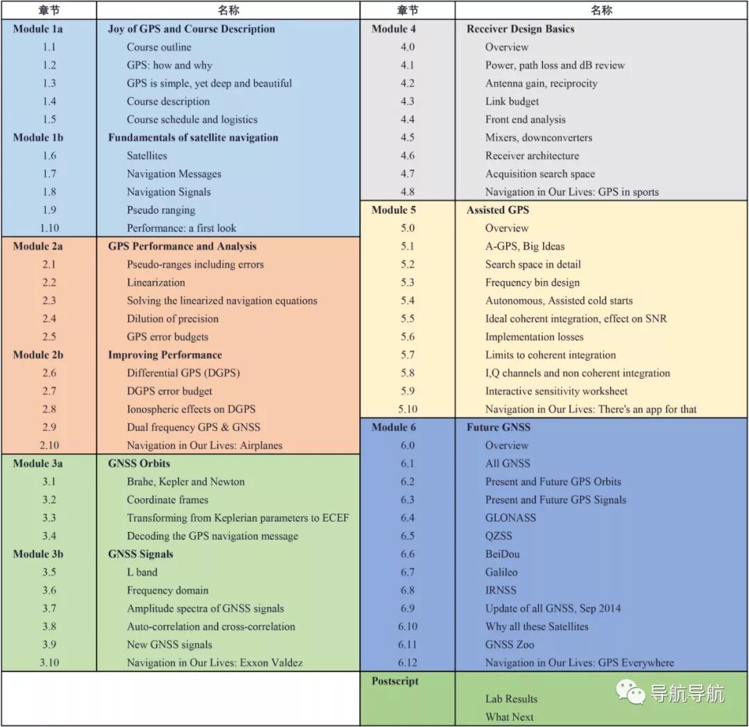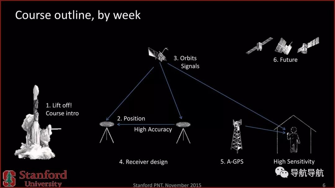 本公开课由 Frank van Diggelen 和 Per Enge 分 6 章对卫星定位的理论基础和 GPS 基本工作原理进行讲授, 课程结构如下图