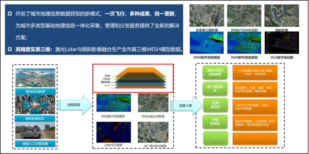 本项目成果包括点间距0.5米的机载激光点云(LiDAR)数据,影像分辨率优于0.05米的倾斜摄影测量数据,平面精度0.6米、高程精度0.3米的倾斜摄影真三维(MESH)模型,真正射影像(TDOM),数字表面模型(DSM)和地面街景扫描影像数据,共计六项。如此高精度、高分辨率的全市域大规模倾斜摄影真三维城市建模在我国尚属首次。