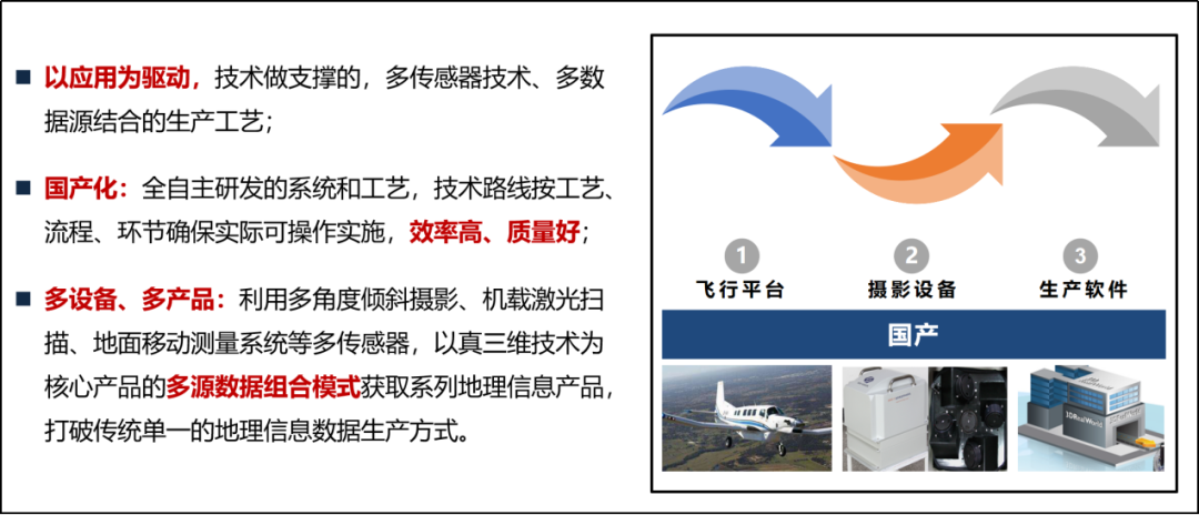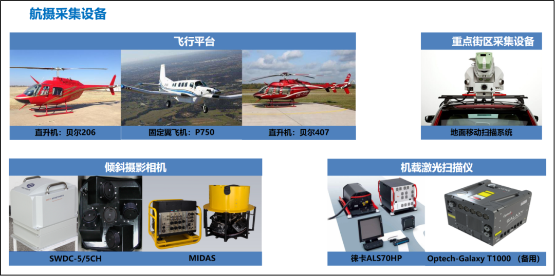 项目主要依托固定翼飞机、直升机、多旋翼无人机、移动车等平台,搭载多角度倾斜摄影航摄仪、机载激光扫描仪、全景相机等多套采集设备,采用了跨平台、多设备的城市空间信息数据全方位感知工作方案,采集了覆盖全市的高精度倾斜摄影测量影像、激光扫描数据,以及重点片区的街景影像。