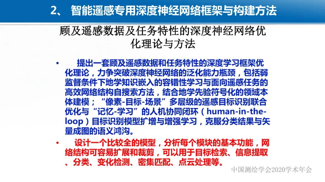 10月28日,中国测绘学会2020学术年会测绘科技沙龙上,龚健雅院士提出深度学习是当代人工智能发展的核心技术,而大数据是深度学习的基础。遥感领域缺乏具有数据驱动能力的大规模样本库,如涵盖不同区域的样本,或是由于行业保守不愿提供样本,导致样本数量较少。同时,还缺乏高光谱、红外等遥感影像的样本数据。