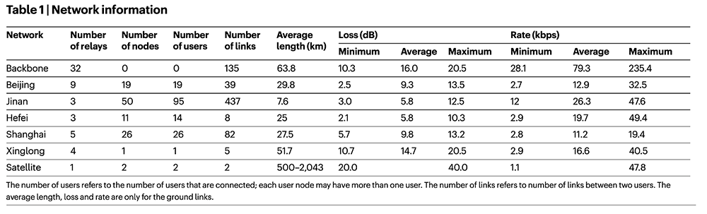量子通信网络在各地节点的关键参数