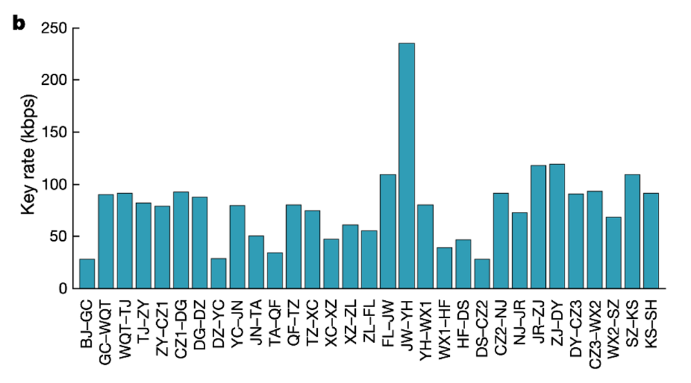 除了链路初始稳定的早期阶段,整体系统逐渐趋于稳定,最小密钥率通常超过20kbps。作为补充,他们给出了济南QMAN的可靠性测试结果,该系统连续运行17个月,通过了数万次服务测试,成功概率超过99%。在2017年12月的骨干网测试示例中,还显示了每两个相邻节点之间的平均关键率。所有31条骨干链路的密钥速率都远高于28kbps,最大密钥速率达235.4kbps。