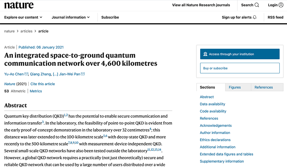 他们把量子技术“玩”上太空!造了一张4600公里的量子通信网络智东西1月7日消息,今日凌晨,中科院院士、中国科学技术大学教授潘建伟团队再次登上顶级科学期刊《Nature》,推出量子通信领域的重磅成果,他们通过“墨子号”卫星与京沪干线的串联,首次构建了一张集成的空间对地量子通信网络,综合通信链路距离长达4600公里。据了解,该网络由700多个光纤量子密钥分发(QKD)链路的大规模光纤网络,以及2个高速卫星对地自由空间QKD链路组成。地面光纤网络采用可信的中继结构,覆盖2000多公里,提供了实际的安全性、可靠性和稳定性。同时,卫星对地QKD技术的平均密钥传输速率达47.8kb,比之前的“墨子号”卫星实验提高40倍以上,其信道损耗量与对地静止卫星与地面之间的信道损耗相近,这使得通过地静止卫星构建更多功能和超长量子链路成为可能。基于此,研究人员通过结合光纤和自由空间QKD链路,将QKD网络扩展到2600公里外的远程节点,使网络内的任何用户都能与其他人进行通信。目前,在现实条件下,两个地面用户之间直接通过光纤分发量子密钥,最远距离也只能达到约100公里。这项研究成果已在线发表于《Nature》上,名为《一个超过4600公里的集成星地量子通信网络(An integrated space-to-ground quantum communication network over 4,600 kilometres)》。