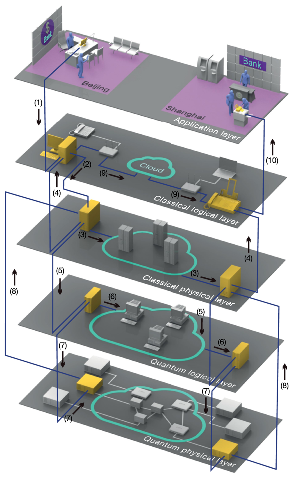 骨干网为线状拓扑结构,由32个可信中继节点和31条链路构成。北京、济南、上海和合肥城域网,以及骨干网和兴隆地网的平均关键速率分别为12.9kbps、26.3kbps、19.7kbps、11.2kbps、79.3kbps和19.6kbps。为了保证在主骨干线上拥有更高的安全密钥率,研究人员使用了多对QKD系统。通过密集波分复用技术,一个骨干光纤链路能同时运行几对设备。与一对器件相比,使用多对器件的关键码率可增加5倍以上。为了建立一个高效并支持大量用户的大规模量子通信网络,研究人员构建了五层网络架构:量子物理层、量子逻辑层、经典物理层、经典逻辑层、应用层。