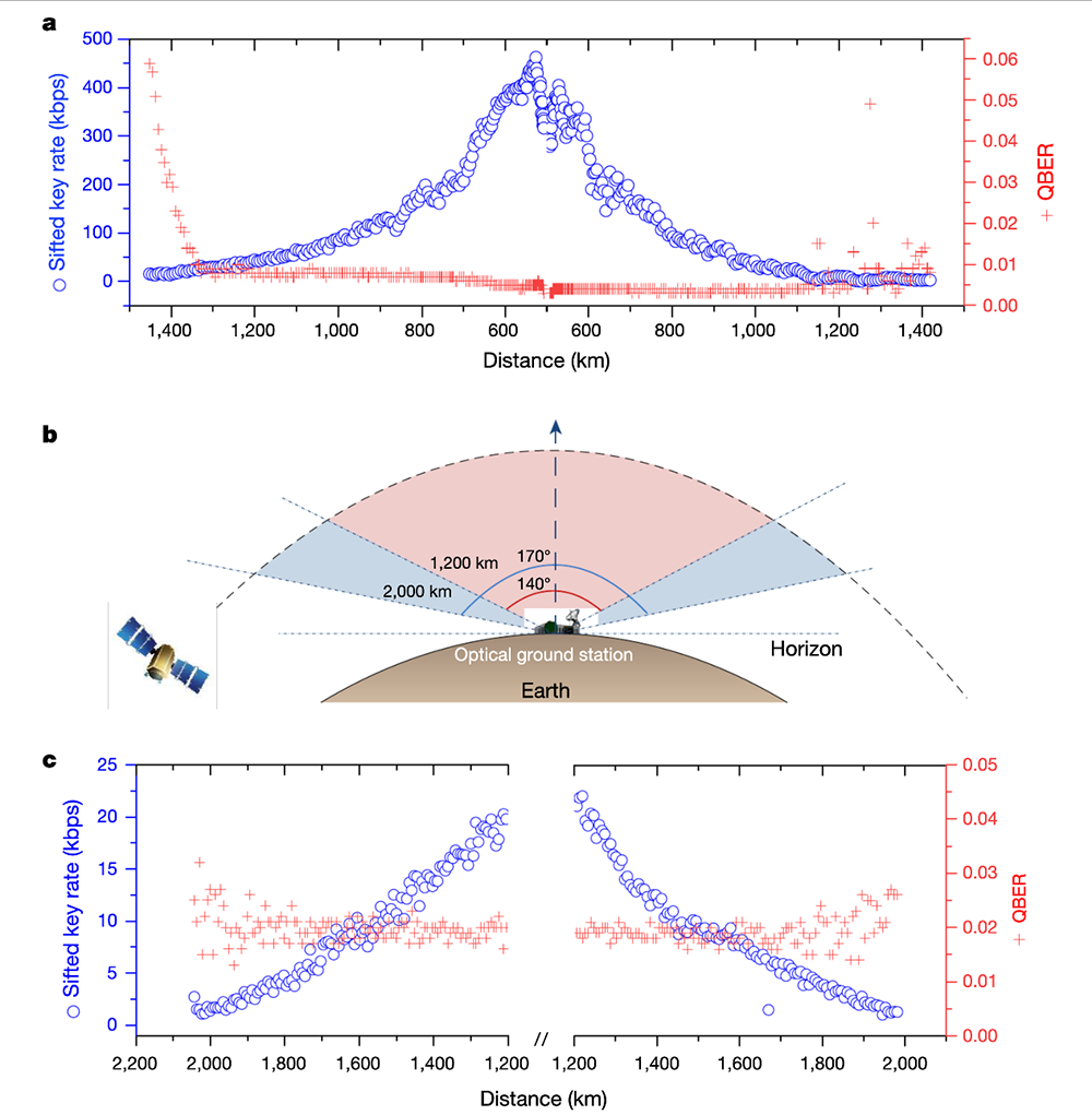 “墨子号”沿太阳同步轨道飞行,高度约500公里,在当地时间大约00时经过地面站,为下行量子密钥分配实验提供了条件。在实验过程中,从508km到超过1200km的通信距离能采集到58.1Mbit的过筛密钥,平均量子误码率(QBER)为0.50%,最高的筛选键率(462kbps)在轨道中心点附近。通过BB84高效的后处理程序,研究人员提取了最终的安全密钥。一般情况下,他们每周能获得约36Mbit的总密钥大小,通过“墨子号”一颗卫星每周生成的密钥能支持约6000个用户。对于每一对卫星用户(主要是银行用户),密钥每10天更新并刷新一次,速度为8Kbit(128个密钥的64个种子)。目前为止,关键速率仍受到“墨子号”低轨道运行时间的限制。未来,如果能利用一颗地球同步卫星和多颗卫星组成一个卫星星座,就可大幅度提高密钥率。![]()