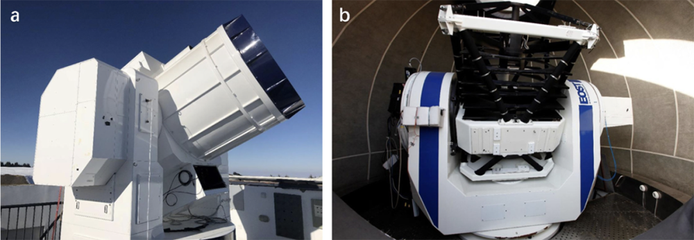 地面硬件设施,分别为南山地面站的1.2米望远镜(a)、兴隆地面站的1米望远镜(b)