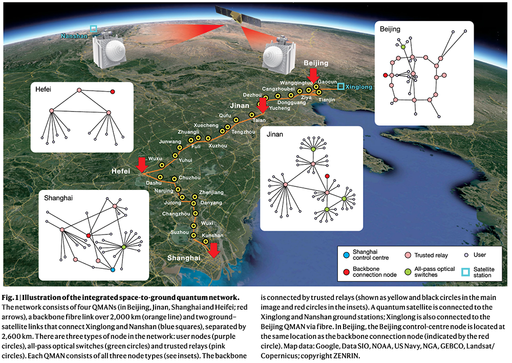 在研究人员看来,一个实用的量子广域网络应具备以下条件:为了进一步推动这项技术的发展,使其能更快实现落地,需要通过开发基于卫星的高速QKD来提高关键速率。潘建伟团队通过构建一个大型量子网络,已在这方面取得实质性进展。该网络由分布于北京、济南、合肥、上海四地的4个光纤队列管理器(QMAN),以及一条超2000公里的长距离光纤骨干网、两条连接兴隆和南山的地星链路组成。它还包括700条QKD光纤链路,比现有的网络大10倍以上。在地面上,光纤网络已为150多个用户提供服务。