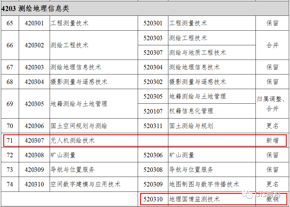 高等职业教育专科新旧专业对照表中(4203)测绘地理信息类