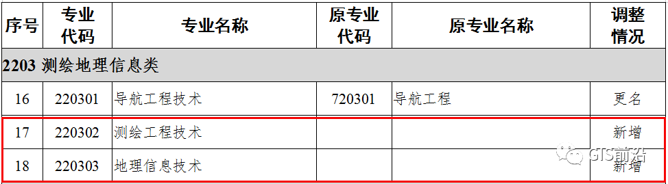 新增 测绘工程技术(220302)和地理信息技术(220303)