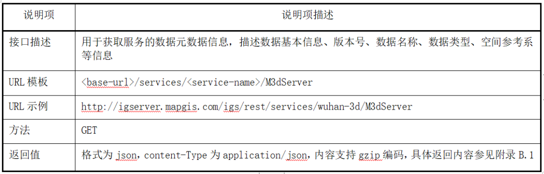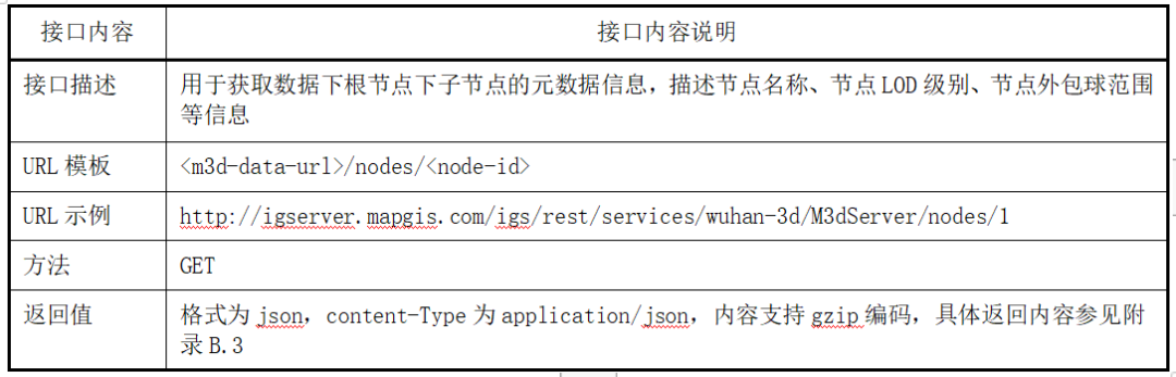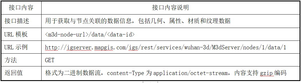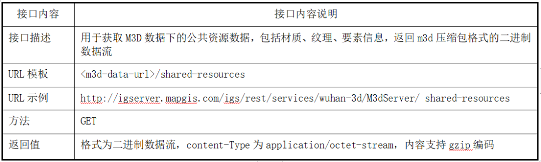 M3D数据信息(M3DData)获取服务:用于描述M3D数据的基本信息,应包括数据所有者、版本号、数据名称、数据类型、空间参考系等信息。该接口应包含获取公共资源、获取根节点资源两个子接口。M3DData接口说明见下表。M3D公共资源(M3DSharedResources)获取服务:包括数据中可共享使用的材质、纹理、要素信息,如下表所所示。M3D数据节点描述信息(M3DNodeInfo)获取服务:用于描述M3D树形结构的非根节点,应包括节点名称、节点LOD级别、节点外包球范围等信息。其中,叶子节点应包含数据URL资源,可获取要素、几何、属性、纹理图片数据资源,接口说明如下表所示。M3D节点数据信息(M3DNodeData)获取服务:可返回节点下指定数据的二进制压缩文件,应包括几何数据信息、属性数据信息、纹理数据信息。M3D节点数据信息获取接口如下表 所示。目前,M3D数据格式及服务接口已成功应用到武汉城市多要素项目、深圳市可视化城市空间数字平台项目,充分展现了M3D规范可以支撑全空间场景模型的高效渲染。后期国内各大数据生产厂商也将会陆续完成与该标准格式及服务的对接。
