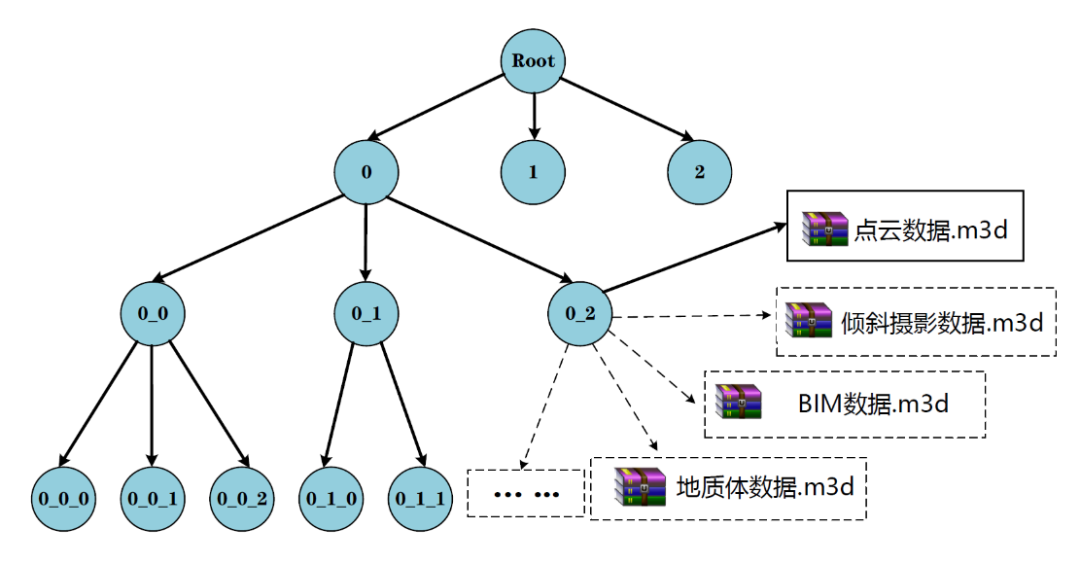 (3) 数据树型结构:M3D数据宜采用四叉树、八叉树、K-D 树等树形结构来组织数据。通过节点与数据分离的机制降低数据传输量,加速M3D数据文件检索的效率,单个节点可关联多个M3D数据,使得一个特定语义的实体可以用多种M3D数据表达。树形结构相关对象的组织结构如图所示。 (1) 文件结构:M3D数据压缩文件是具体的M3D数据信息,应包含几何要素文件、属性记录文件和纹理图片文件三部分内容。几何要素文件描述一个空间范围内的三维数据的几何及材质信息;属性记录文件描述数据的属性结构、属性字段和属性记录;纹理图片文件是指材质信息中关联的纹理图片文件(2) 几何文件结构:几何要素文件描述一个空间范围内的三维数据的几何信息,包括空中、地上、地表、地下数据的几何描述信息及几何数据信息。其中,地质模型几何结构信息应存储到GLBX几何要素文件中,其它数据类型采用三角网格几何结构(3) 属性记录文件(Record对象),采用json或bin文件格式存储,用于描述M3D压缩文件中的属性数据信息M3D服务接口遵循RESTful设计规范,可通过三维客户端调用该服务。具体包括M3D数据信息获取服务、公共资源获取服务、根节点信息获取服务、节点描述信息获取服务、节点数据信息获取服务、几何信息获取服务、属性信息获取服务以及纹理信息获取服务。