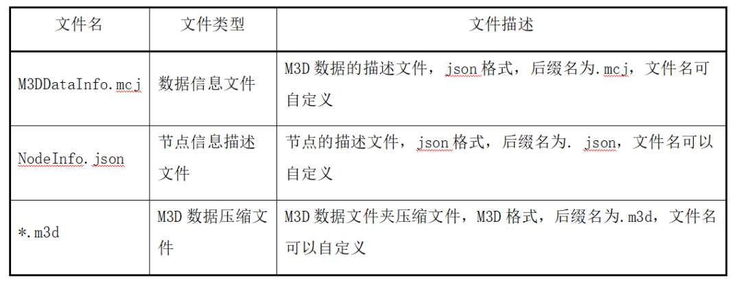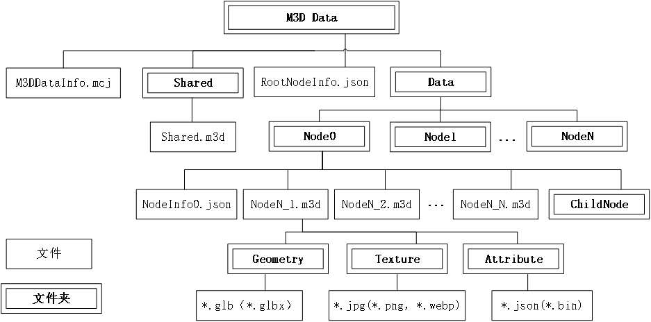 (1) 数据文件结构:M3D数据采用数据文件和节点描述文件分离的数据结构,通过文件夹对数据进行组织,可在不加载实际数据的情况下,获取M3D数据每个节点的包围盒、LOD的切换信息、挂接的M3D数据文件等内容。数据文件的整体结构设计如下图所示:(2) 数据文件描述:本文件规定的数据组成文件包括数据信息文件M3DDataInfo.mcj、节点信息描述文件NodeInfo.json、M3D数据压缩文件*.m3d。