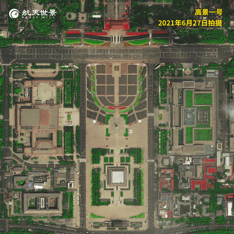 庆祝中国共产党成立100周年大会于2021年7月1日在天安门广场举行,高景一号记录下了建党百年庆祝大会前期准备的影像。
