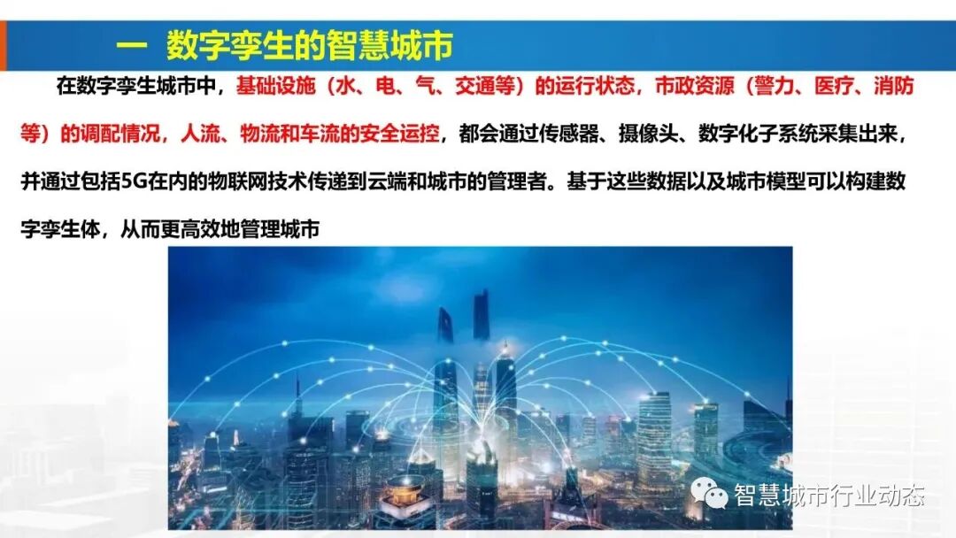 5、在数字孪生城市中基础设施(水、电、气、交通等)的运行状态,市政资源(警力、医疗、消防等)的调配情况,人流、物流和车流的安全运控,都会通过传感器、 摄像头、数字化子系统采集出来 并通过包括5G在内的物联网技术传递到云端和城市的管理者。基于这这些数据以及城市模型可以构建数字孪生体,从而更高效地管理城市