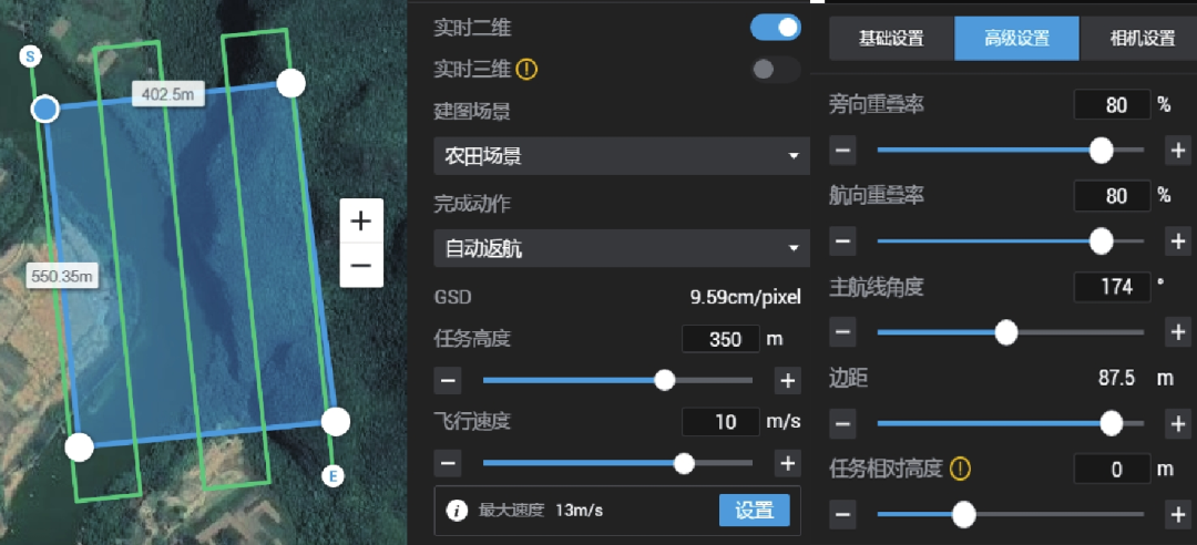 文章以广西宁明花山岩画为例,基于贴近摄影测量技术来实现户外大型文物数字化,解决大型户外诸如佛窟、岩画、雕塑、古代建筑等文物高精度、三维数字化的难题,为贴近摄影测量应用于地质灾害、建筑、应急指挥、桥梁监测、智慧矿山、水利水工监测等提供参考。 文物数字化; 无人机; 贴近摄影测量; 航线规划; 三维建模; 文物保护; 宁明花山文物是人类在社会活动中遗留下来的具有历史、艺术、科学价值的遗物和遗迹,是人类宝贵的历史文化遗产。文物的数字化对文物的保护具有重要的历史和现实意义,可以拉近人们对文物的了解和欣赏的距离,也是走向公众参与教育和价值观建构、走向世界参与文明互鉴的基础[1]。然而岩画、洞窟等大型户外文物数字化的实现是困难的,一方面受限于空间障碍,另一方面受限于数字采集技术。近年来,随着无人机技术的高速发展,为实现大型户外文物数字化提供了技术支持。无人机有2项技术:一项是云台姿态控制技术。云台安装的摄像机可用于基于视觉的小型无人机目标跟踪与定位,分析无人机平移和旋转运动对目标在图像平面成像的影响,推导机体角速度与云台姿态角速度转换矩阵,设计基于运动补偿的云台控制器将无人机速度和机体角速度引入云台控制器输入,补偿因无人机运动引起的摄像机视线改变,并利用目标在图像平面的位置偏差修正摄像机跟踪误差。仿真实验表明,所设计的云台控制器可提高目标跟踪精度,减少云台抖动[2]。另一项是航测高精度定位技术,即RTK测量技术。RTK(real time kinematic)测量系统由3部分组成,即GPS接收设备、数据传输系统和实施动态测量的软件系统。RTK测量技术以载波相位观测量为根据,它能够实时获得测站点在指定坐标系中的三维定位结果,且具有厘米级的定位精度[3]。无人机的这2项技术又衍生了新的摄影测量技术——贴近摄影测量。贴近摄影测量是由武汉大学遥感信息工程学院张祖勋院士于2019年提出。贴近摄影测量被称之为区别于垂直航空摄影测量、倾斜摄影测量的第三种摄影测量方式。贴近摄影测量利用拍摄设备贴近物体表面摄影,获取(亚厘米级)高清影像,并进行摄影测量处理,从而恢复被摄对象的精确坐标和精细形状结构来重建精细三维模型,弥补了其他摄影测量无法达到的精度要求[4-5]。花山岩画地处广西崇左市宁明县左江明江河段。遗产区面积6 621 hm2,已有2 000多年历史。岩画地点分布广、作画难度大、画面雄伟壮观,为国内外罕见,具有很强的艺术价值和重要的考古科研价值。笔者运用贴近摄影测量技术来实现花山岩画的数字化。拍摄所备的硬件设备:大疆经纬M3OOR+禅思P1航测相机1套、精灵Phantom 4 RTK 1套。这2款大疆无人机具有飞控稳定、功能强大、RTK定位精确等优势。同时,为及时处理现场数据,笔者还配备了2台高性能的移动PC工作站。此次拍摄所采用的软件有大疆智图和航迹大师(WayPoint Master)。大疆智图是一款提供自主航线规划、飞行航拍、二维正射影像与三维模型重建的 PC 应用软件,可一站式帮助用户全面提升航测内外业效率,将真实场景转化为数字资产。航迹大师(WayPoint Master)是一款针对大疆无人机倾斜摄影测量的专业级航线定制软件,特有的交叉如环绕航线、仿地航线、仿面航线、变坡航线、立面航线、Lidar航线、电力航线等可以满足多种场景需求。作业区域的崖面临江而立,崖体呈南北弧形内凹状,宽250 m,高150 m。岩画大致分布于离江面高8~35 m的白色岩体表面。江边不规则分布竹丛及高7~8 m的杂树,悬崖上有灌木和草丛,航飞条件复杂。高耸内凹的垂直崖面对无人机PGS信号的接收影响大,有可能造成无人机接收不到卫星信号导致无人机失控撞崖炸机的风险。为了安全有效地实施贴近摄影测量,作业前必须先规划一组常规的航线来获取准确的地形数据——粗模。粗模是贴近摄影测量航线规划必备的重要条件。从收集到的资料分析可知,作业区域的江面到山顶的垂直落差约240 m,因此笔者使用精灵Phantom 4 RTK设置了一个350 m航高的建图航拍工程,航向和旁向重叠度设为80 %(见图1)。 ![图片1.png]()