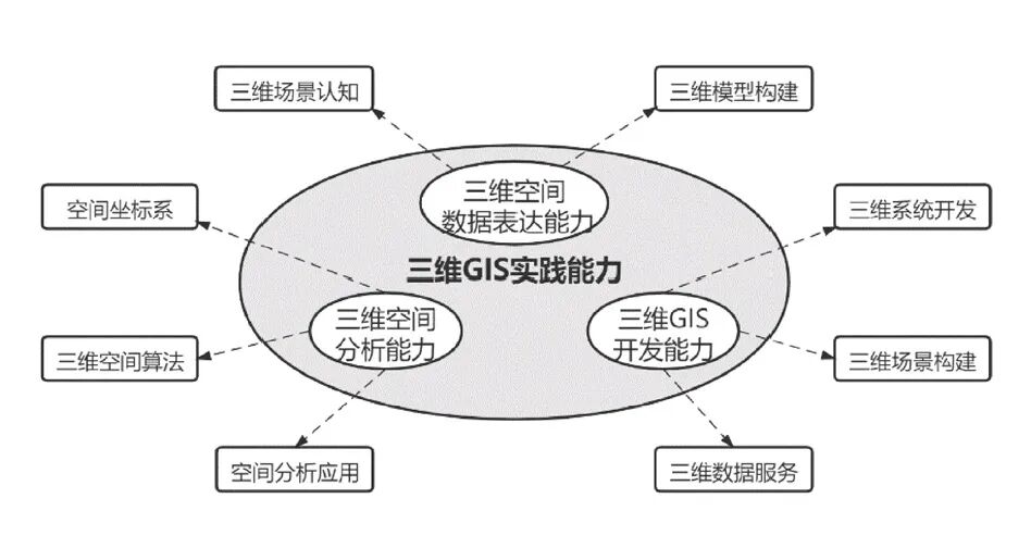 在应用实践中,三维GIS与二维GIS存在着显著区别,三维GIS场景往往有数据量大、尺度跨越大、符号动态表达、计算开销大、实时性强、交互程度高等特点。因此,三维GIS实践能力培养可从三维空间数据表达、空间分析和系统开发等3方面找准着力点(图1)。