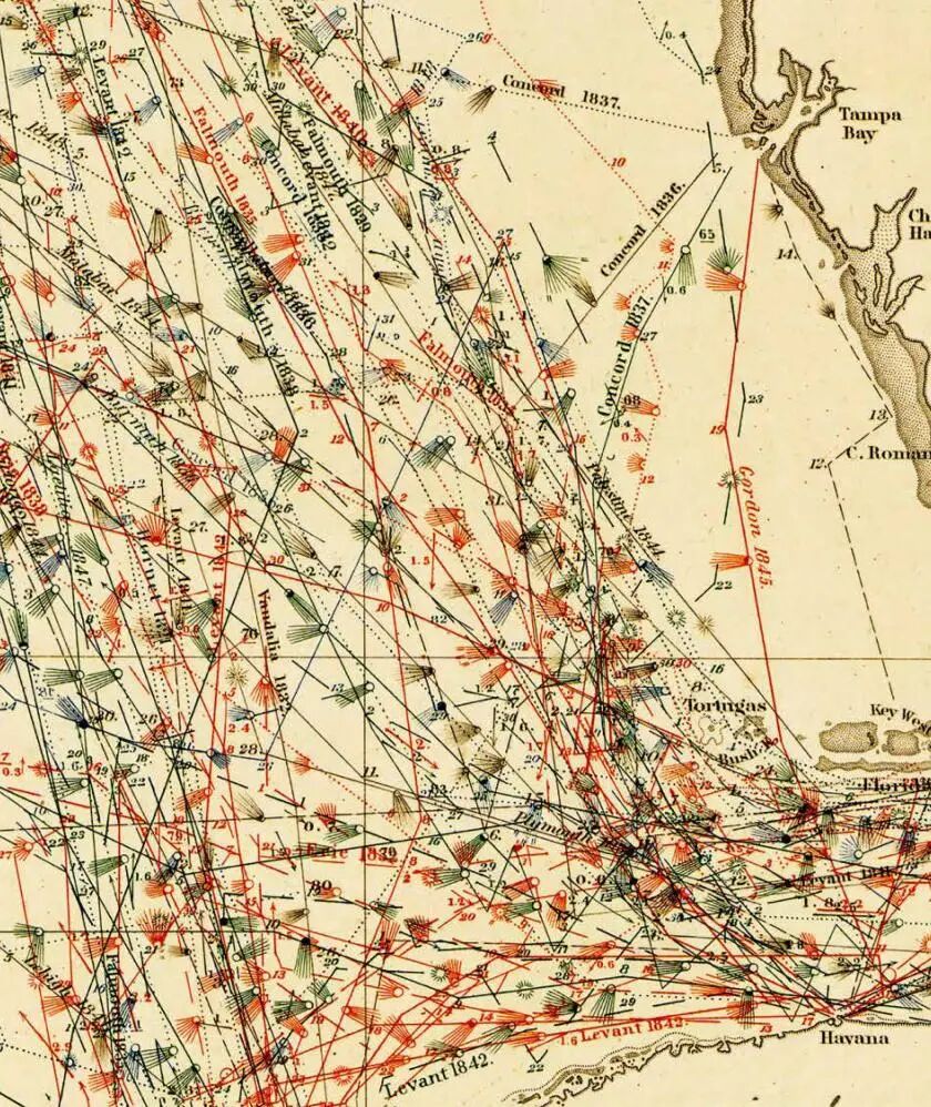 海洋学家莫里根据大量的航海日志绘制的洋流图,每一种线条颜色代表一次航行路线,刷子状的符号代表船长日志中对海风速度和变化的注记。这张图揭示了洋流与季风的规律,他也凭借这一发现成为“现代海洋学之父”