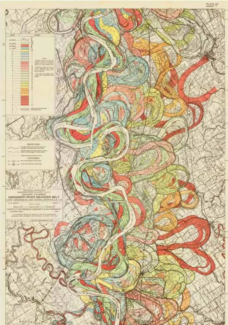 被喻为制图典范的密西西比河旧河道的彩色地图,揭示了河流改道的趋势。不同的颜色代表了不同时期的河道。每次河水泛滥都会形成沉积,如此循环往复,不断调整着河流的蜿蜒长度
