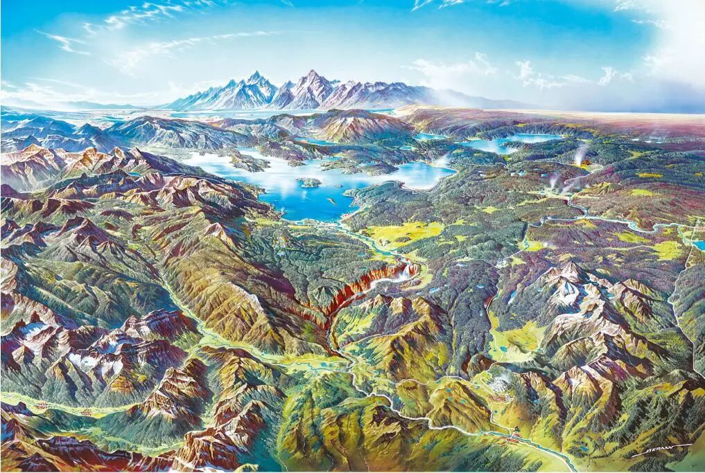 奥地利艺术家贝伦绘制的美国黄石国家公园全景图,通过旋转山脉角度、放大重要地标等形式,多方位展现轮廓,呈现了一个比实际场景更美的画面