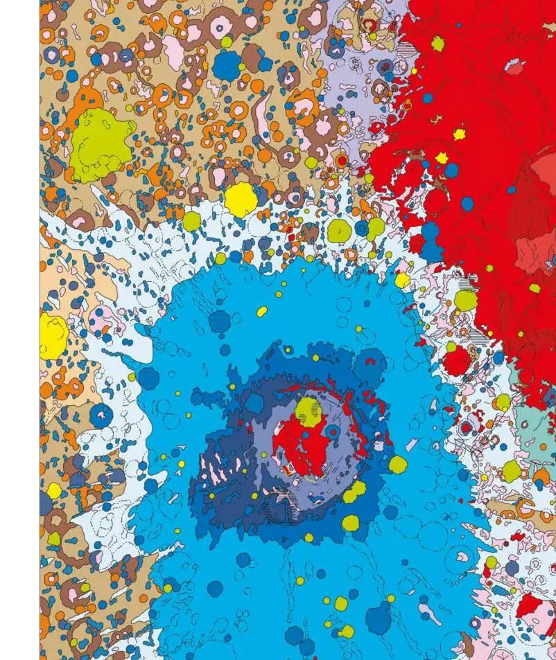 美国地质勘探局制作的月球西侧地图,不同的颜色标注出了不同类型和年龄的撞击坑。喷溅状的蓝色区域是东方盆地,也是月球上最大的撞击坑之一。鲜红色部分代表了后来的熔岩流。这些信息都来自于阿波罗飞船和水手9号探测器