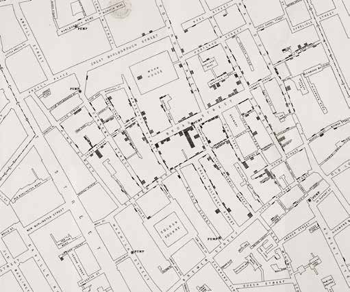著名的约翰·斯诺地图绘制了伦敦苏霍区1854年霍乱暴发情况,患者集中在宽街的一个水泵附近,从而得出它是一种水源性传播的疾病,而不是靠空气传播,拯救了无数人的性命
