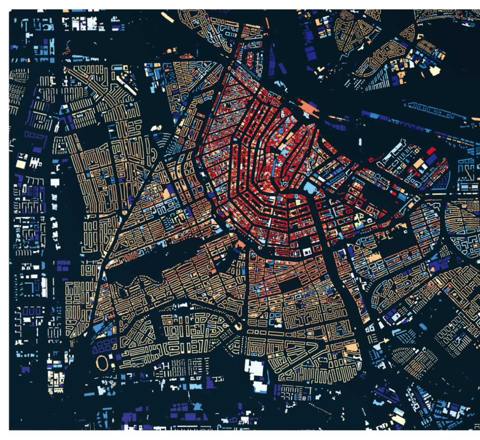 阿姆斯特丹的城市变迁图,颜色越深代表了建筑年份越久,从这张图可以直观地看出城市的规划、历史与扩张