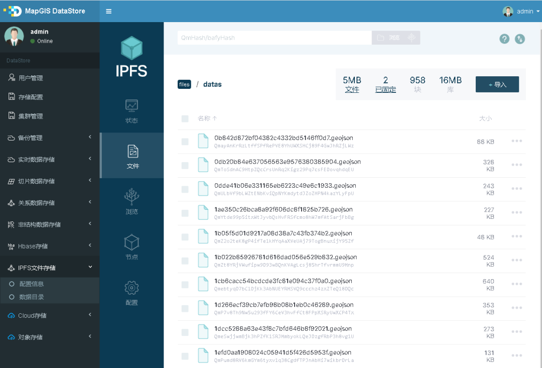 在功能上,MapGIS区块链提供运维管理功能,包括联盟管理、通道(子链)管理、合约管理、证书权限安全管理等管理功能,为区块链运维管理提供辅助工具;提供地理空间数据上链功能,一方面支持矢量数据上链、数据集管理、数据查询、历史追溯等,另外一方面支持影像、图片、视频等非结构化文件上链管理功能。