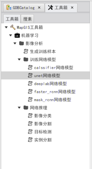 MapGIS默认提供基于Faster-RCNN 模型进行影像目标检测,也可根据具体的应用场景,选用更适合的深度学习网络模型进行影像目标检测。依照模型训练的周期时长,MapGIS提供支持短周期模型训练的MapGIS桌面端训练工具和支持长周期模型训练的MapGIS Web端服务方式训练工具。如下图为MapGIS桌面端的模型训练工具: