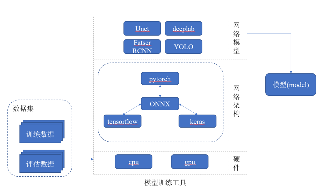 模型构建与管理,即基于前期数据准备过程中生成的训练数据样本,训练神经网络模型,同时通过验证集和测试集对训练模型进行不断的迭代评估,以达到实际的应用准确度和精准度要求。如下图所示为MapGIS深度学习功能训练流程: