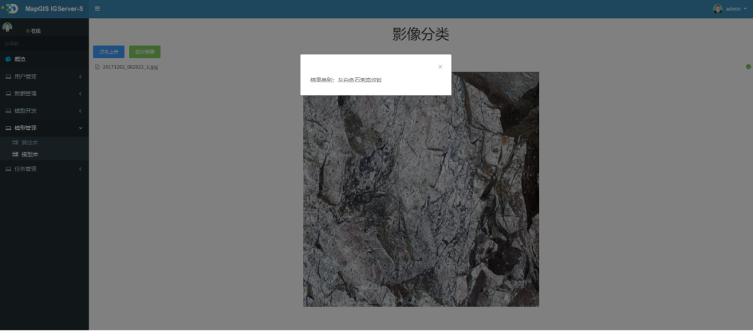 MapGIS基于高层视觉信息,提供了深度网络模型残差网络(resnet)等30多种网络用于提取图像的抽象语义信息,无需人工取特征,经过充分训练后的网络分类效果也比较理想。影像分类不仅仅可以用于较大尺度的分类任务,如城市局部气候区分类等,还可以以图片为单位对相类似图片进行区分,例如根据给定岩石图片进行岩性识别,如下图为灰白石泡流纹岩石的识别结果: