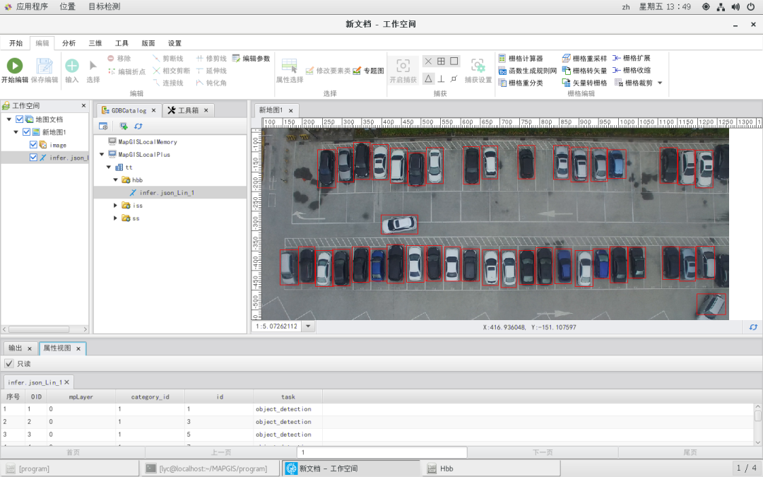 在MapGIS深度学习工具中,目标检测使用深度学习算法对遥感图像中的一个或多个目标的类别和位置进行自动化判定与识别,并以矢量框的形式作为标记,确定其类别和位置。采用深度学习的方法,改进影像数据目标检测的过程,针对遥感图像上常见的同类目标大小不一的情况,优化对小目标的识别能力,以达到更好的检测结果。整个过程只需要输入一幅影像和确定识别目标类别,就能快速获得兴趣目标的矢量数据。下图为无人机拍摄某区域的车辆目标检测结果,红色框为检测出来的车辆,可以快速准确定位车辆分布、位置及数量,为车辆管理、车辆管控等领域提供基本的数据支撑。