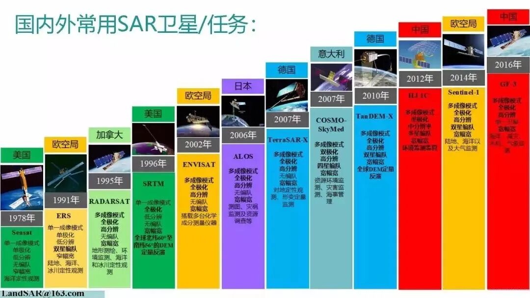 雷达遥感卫星主要包括星载合成孔径雷达 (Spaceborne SAR) ,星载雷达高度计,星载雷达辐射计,星载雷达散射计,天基情报侦察监视(ISR)雷达,星载穿透性探地雷达,星载气象雷达等。其中星载合成孔径雷达是一种成像雷达,其把SAR载荷装载在卫星平台上,利用雷达与目标的相对运动把尺寸较小的真实天线孔径合成一较大的等效天线孔径获得高的方位向高分辨率(多普勒带宽);同时通过发射大时间带宽积信号,如线性调频信号,通过脉冲压缩,获得距离向高分辨率。由于其具有全天侯、全天时工作、大幅宽大面积成像和穿透能力,已成为对地观测的重要手段,受到各国的广泛重视。目前,星载SAR在军事侦察、监视和目标搜索跟踪引导瞄准、测绘、灾害监测、资源调查和海洋研究等领域显示出广阔的应用价值和巨大的潜力。