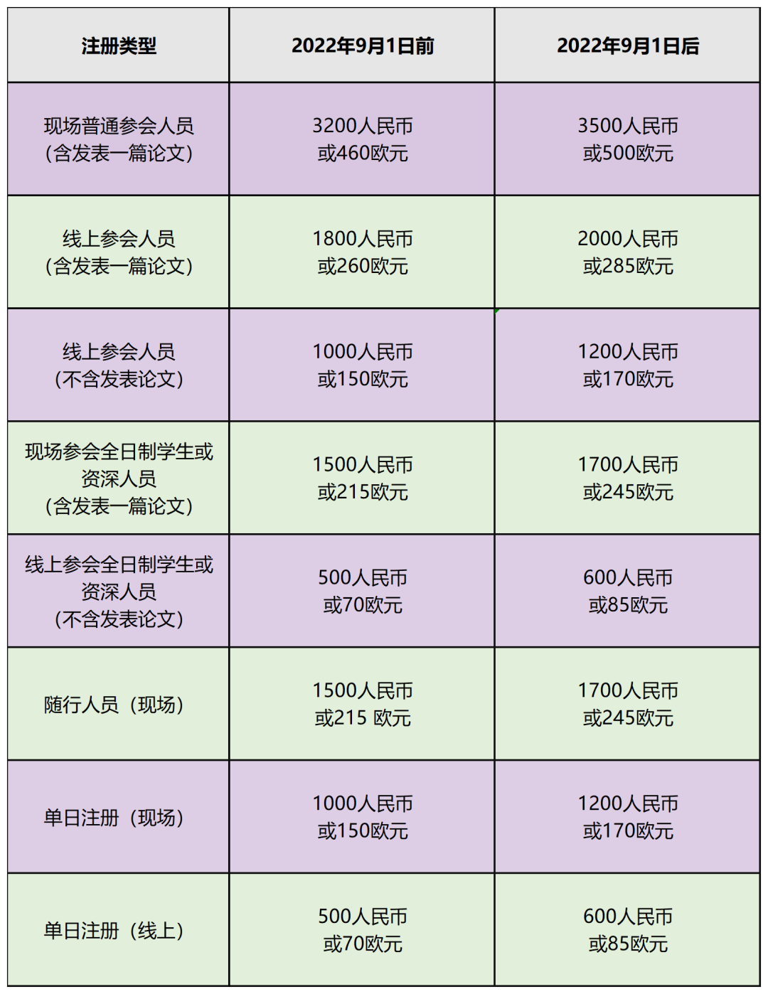 参会人员需缴纳会议注册费。2022年9月1日前注册可享受优惠。注册费分类如下: