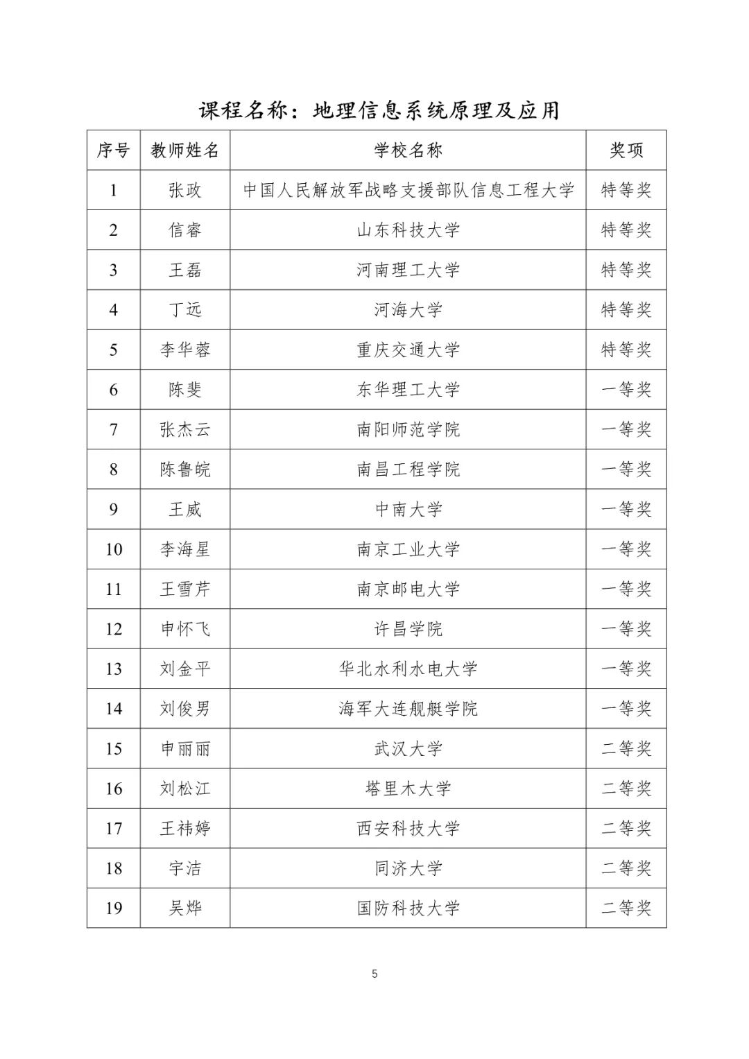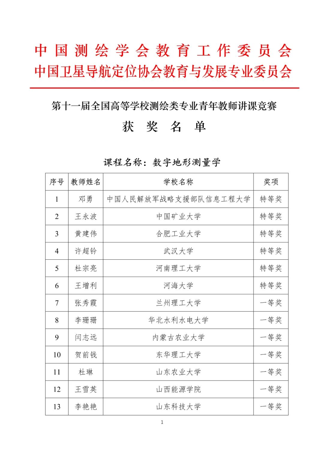第十一届全国高等学校测绘类专业青年教师讲课竞赛获奖名单