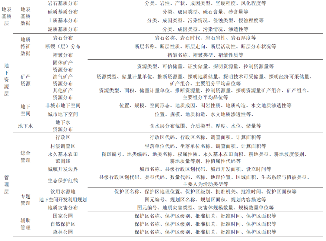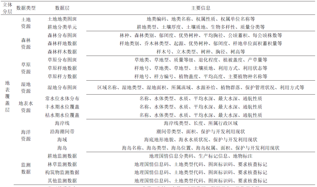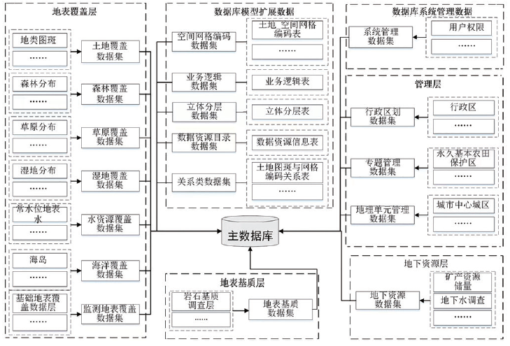 1)全面调研自然资源调查监测数据资源,系统梳理国家级自然资源管理综合业务需求,开展主数据库内容体系设计。调研各项自然资源调查监测的工作现状、数据成果,收集相关技术规范和数据成果示例,开展数据内容、三维立体特征、属性、精度、指标和数据格式等分析;调研自然资源部相关业务司局关于自然资源管理的具体业务需求,梳理三维立体环境下对数据内容、多专题融合以及分析评价模型等方面的支撑要求。基于调研分析结果,系统梳理出土地、矿产、森林、草原、湿地、水、海域海岛等各类自然资源,以及荒漠化、沙化、石漠化、野生动物等专题调查成果中通用、核心数据内容,还有与时态、位置、数量、质量、生态相关的三维立体时空特征,并对应地下资源层、地表基质层、地表覆盖层、管理层4层调查监测体系,统筹设计主数据库的内容、指标、编码、属性、分层等,形成主数据库内容体系。