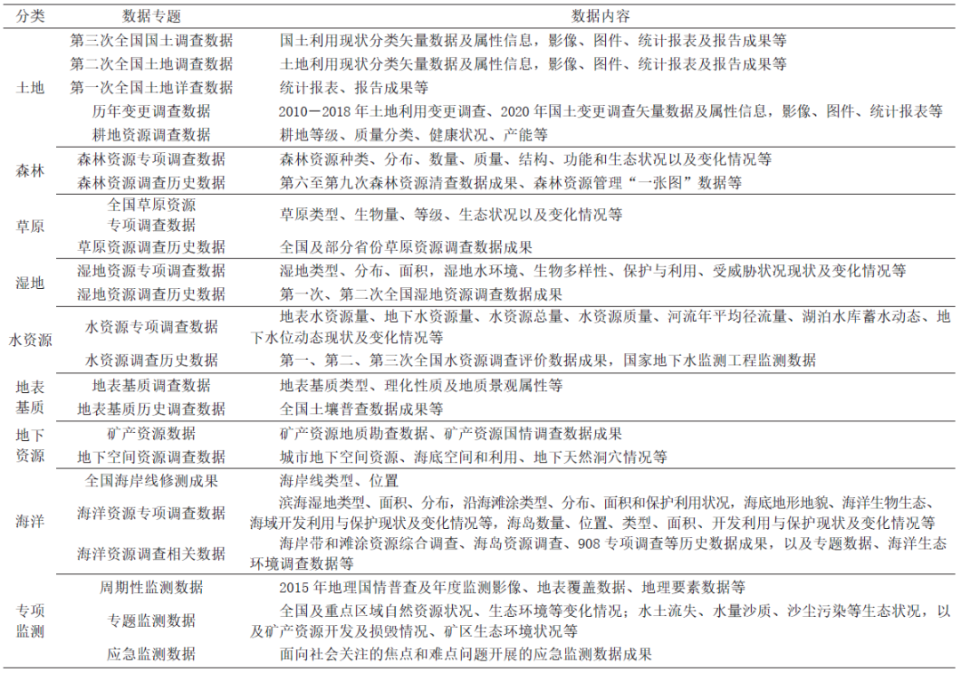 1)自然资源调查监测数据。主要分为土地、森林、草原、湿地、水资源、海洋、地表基质、地下资源、专项监测等 9 类专题数据。每类数据资源的主要内容见表1。