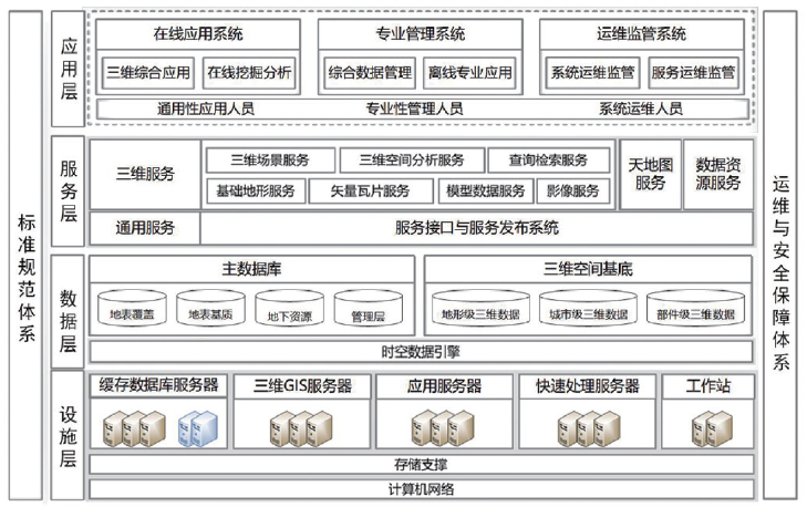 5)基于自主可控的国产三维系统平台,开展数据库管理系统研发。优先采用国产自主可控三维系统平台,以三维实体管理和三维可视化为手段,利用分布式数据库技术,构建由在线应用子系统、专业管理子系统、服务发布子系统和运维监管子系统组成的自然资源三维立体时空主数据库管理系统。其中,在线应用子系统,采用B/S架构,针对三维立体下的快速浏览和在线应用的需要,具有三维可视化浏览、查询、统计分析等功能;专业管理子系统,采用C/S架构,针对数据库的统一管理和专业应用的需要,具有数据库建立、操作、分发、维护,以及深层次的分析应用等功能;服务发布子系统,采用C/S架构,针对自然资源各类数据在线调用需要,具有矢量数据快速服务发布、栅格数据免切片服务发布、三维数据分布式服务发布等功能;运维监管子系统,采用B/S架构,针对7×24h安全、稳定运行的需要,具有主机运行监控、服务资源管理、服务状态监控、服务访问统计等功能。