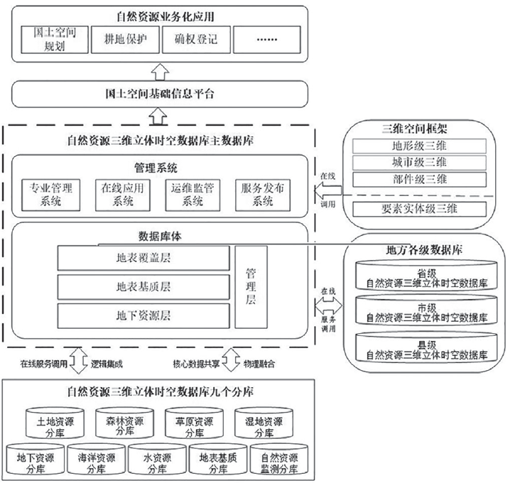 主数据库作为自然资源三维立体时空数据库(图4)的重要组成部分。主数据库通过物理迁移融合9个分数据库的核心数据内容,并在涉密网络链路连通条件下通过服务调用方式逻辑集成9个分数据库内容。同时,分数据库可以通过同样数据共享交换方式,获取主数据库的数据内容,实现主数据库、分数据库的横向连通。在涉密网络链路连通条件下,主数据库按照统一的服务接口,在线调用地方各级数据库的数据服务,地方各级数据库也可调用主数据库和分数据库的数据服务,实现主数据库与地方各级数据库的纵向贯通;主数据库通过在线调用实景三维中国的地形级、城市级、部件级三维数据构成的全国统一的三维空间框架,从而为数据库中各类自然资源的直观表达提供三维空间基底;主数据库接入国土空间基础信息平台和自然资源“一张图”,为国土空间规划和自然资源管理业务应用提供数据服务。相关司局和业务单位作为许可用户,可以通过国土空间基础信息平台使用数据库中的数据资源。