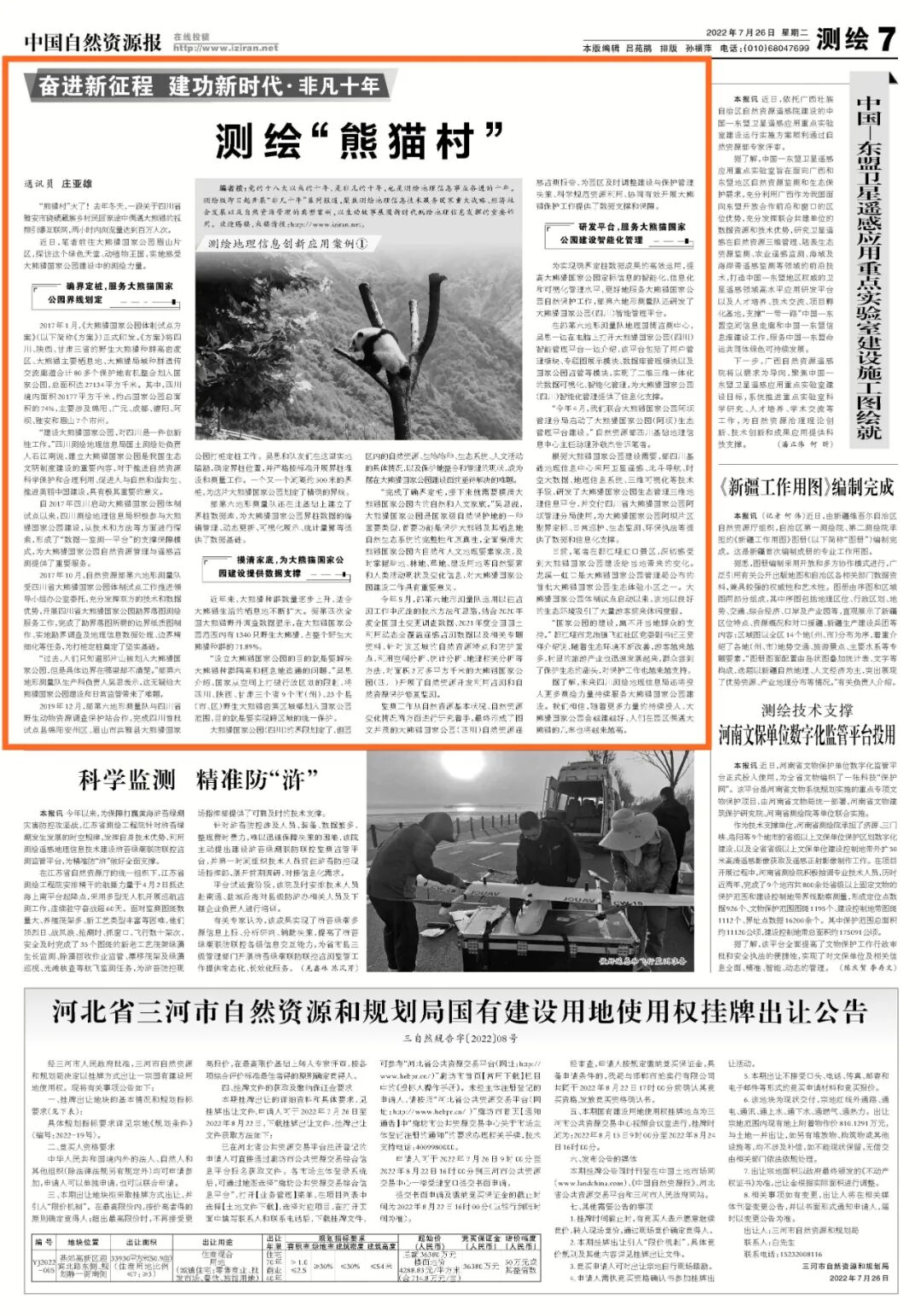 2022年7月26日,《中国自然资源报》第1096期测绘版头条发表测绘地理信息创新应用案例文章《测绘“熊猫村”》。
